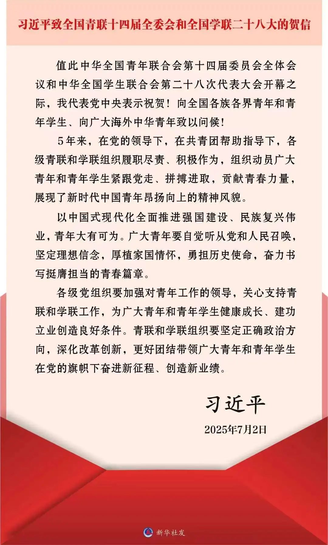 7月2日至3日,中华全国青年联合会第十四届委员会全体会议、中华全国学生联合会第二十八次代表大会在北京召开。中共中央总书记、国家主席、中央军委主席习近平发来贺信,代表党中央表示祝贺,向全国各族各界青年和青年学生、向广大海外中华青年致以问候。
