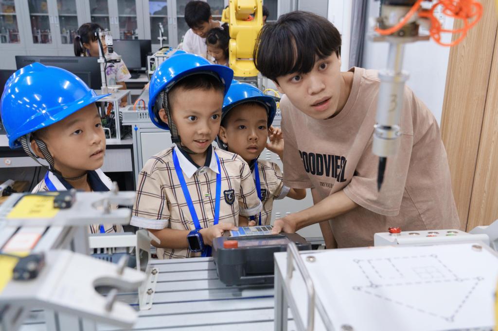 张舒铭老师进行研学班导学,此次研学班课程安排十分丰富,涵盖军事训练、感恩教育、体能训练、手工制作、企业参观等。其中,特色课程亮点十足。如绿色建筑与低碳技术学院带来“小小飞手初体验——无人机科普与实操”,让孩子们操控无人机,探索天空奥秘;现代商贸物流学院开展“小小摄影师初体验——摄影科普与实操”,培养孩子们捕捉美好瞬间的能力;人工智能技术学院的“趣探AI与VR:开启未来科技冒险行”,引领孩子们踏入前沿科技领域,感受AI与VR的神奇等。