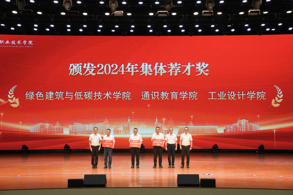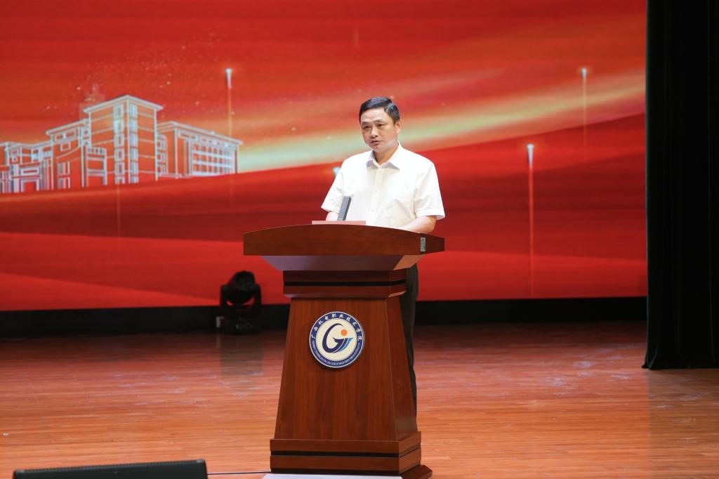 学校2025年“三全育人”先进个人代表陶彬、机电最美教师代表吕金亚、广西工匠代表熊治文、博士代表杜英俊;先进集体代表、人工智能技术学院院长张泽民;2024年集体荐才奖代表、绿色建筑与低碳技术学院党委书记罗满,通识教育学院党委书记、院长黄金来;新入职教师代表蓝婷分别作了交流发言。