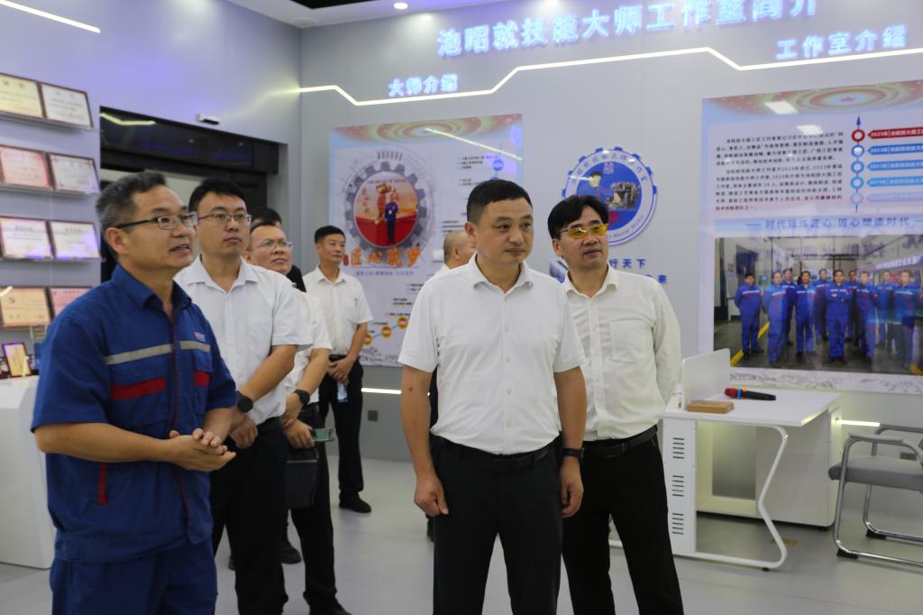 吴世先一行首先来到“池昭就大国工匠工作室”,与池昭就校友进行了深入交流,聆听了池昭就校友从一名普通模具钳工起步,扎根生产一线三十余载,成长为“大国工匠”的奋斗历程。吴世先校长代表学校师生向池昭就校友致以衷心祝贺与诚挚问候。他表示,池昭就校友数十年如一日专注技艺、追求卓越,生动诠释了“劳动光荣、技能宝贵、创造伟大”的时代精神,是全体机电学子身边的榜样。吴校长诚挚地邀请池昭就校友常回母校,通过“匠心铸魂大讲堂”等形式与师生交流分享,将其精湛技艺与工匠精神传递给学生,激励更多青年走技能成才、技能报国之路。