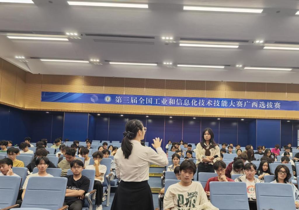 在互动提问环节,学生踊跃交流。面对“基层20年如何突破困难实现成长”的提问,包菊辉分享了招聘遇挫、数据治理烦琐等经历,强调“把每一次挑战当修行,用耐心和细心积累”;针对“青年应培养哪些竞争力”,她建议注重“技术逻辑+产业认知+人文关怀”,扎根基层、精益求精,将个人成长与广西智能产业发展结合。