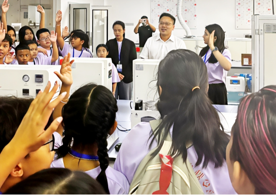 在光储直柔工程研究中心研学时,现场展示的涂布机、对辊机、叠片机、化成机、辊压机等先进设备引起了泰国师生的浓厚兴趣,他们认真聆听技术人员的讲解,尤其在互动环节纷纷举手,就技术原理、实际应用及未来发展前景展开了热烈交流。