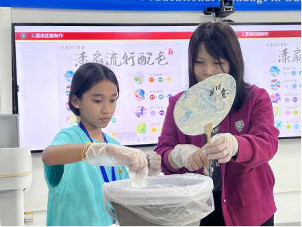 在中国文创产品制作课堂上,泰国青少年们亲手实践,以“烟雨江南”“大漠孤烟”等极具诗意的配色方案,赋予漆扇独特的艺术生命。当一把把亲手打造的漆扇在手中成型,它们便超越了普通手工艺品,成为承载非遗文化的“微缩名片”。