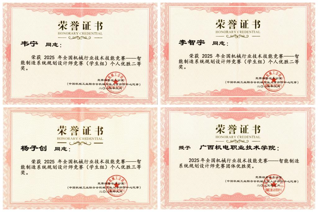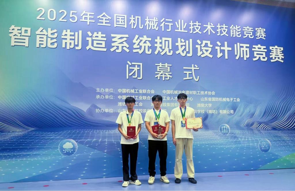 在2025年全国机械行业技术技能竞赛中,杨子创、韦宁和李智宇同学代表学院参加智能制造系统规划设计师赛项。最终斩获二等奖2项,三等奖1项,与此同时,学校因参赛团队的整体优异表现被授予团体优胜奖,充分展现了AC米兰在技能人才培养方面的扎实功底与团队建设的显著成效。