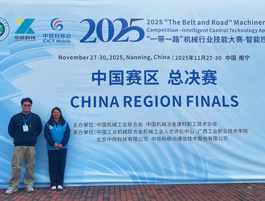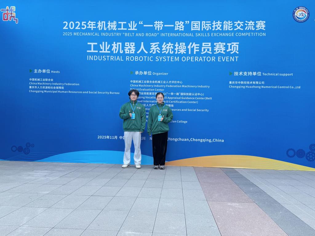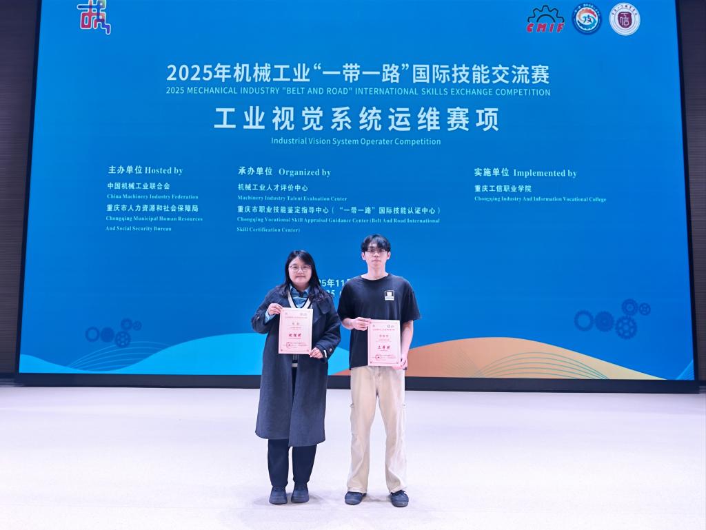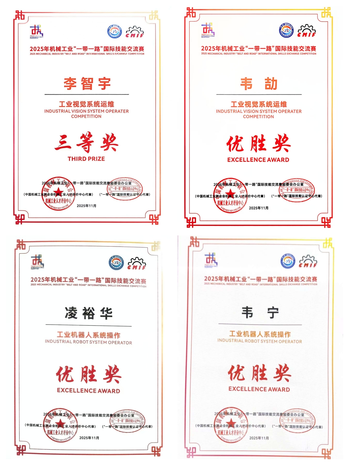 在2025年机械工业“一带一路”国际技能交流赛上,参赛师生与国内外选手同台竞技,积极参与工业视觉系统运维、工业机器人系统操作两大赛项的比拼。最终斩获三等奖2项、优胜奖6项,学校获团体优胜奖单位。