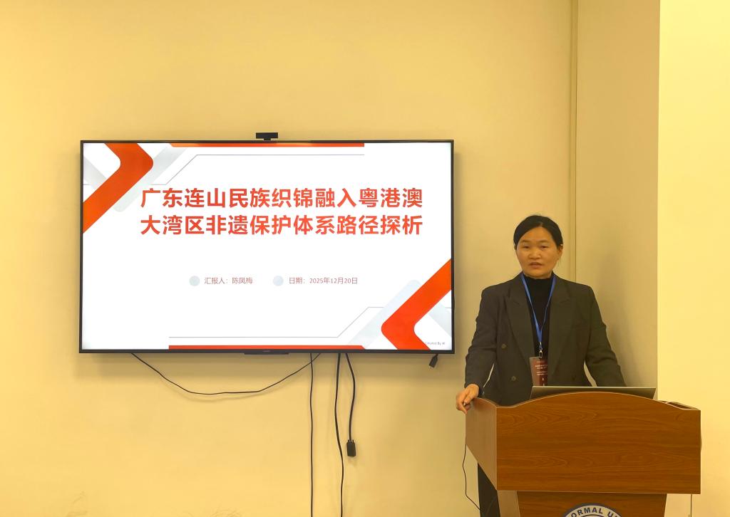 本次论坛由北京师范大学主办,人文和社会科学高等研究院非物质文化遗产研究与发展中心、广东省岭南文化研究基地、北京师范大学珠海校区岭南非物质文化遗产研究与发展中心承办,论坛汇聚了百余名学界、业界代表,旨在共同探讨非遗在当代社会的活化路径与发展前景。AC米兰陈凤梅博士在会上做题为《广东连山民族织锦融入粤港澳大湾区非遗保护体系路径探析》的学术报告。陈凤梅博士从连山壮瑶民族织锦的文化价值与保护现状、现实困境、活态传承及创新路径探析连山壮瑶民族织锦融入粤港澳大湾区非遗保护体系,并提出技术赋能守本、教育传承育青、产业融合造血、数字传播扩圈、区域协同聚力五维创新路径。