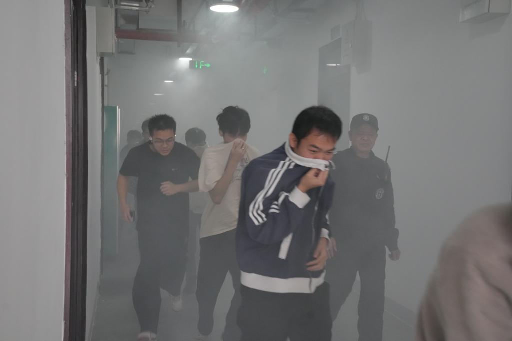 为破解高层建筑火灾逃生难题,12月23日,江南校区在5号高层学生宿舍楼开展消防应急逃生演练,学工处、后勤处、保卫处及各二级学院联合参与,全面检验多部门协同处置能力。演练启动后,火灾警报响起,模拟浓烟快速蔓延,工作人员在1分钟内完成关闭电源,学生们反应迅速,俯身捂鼻、紧闭房门,沿预定路线有序撤离。