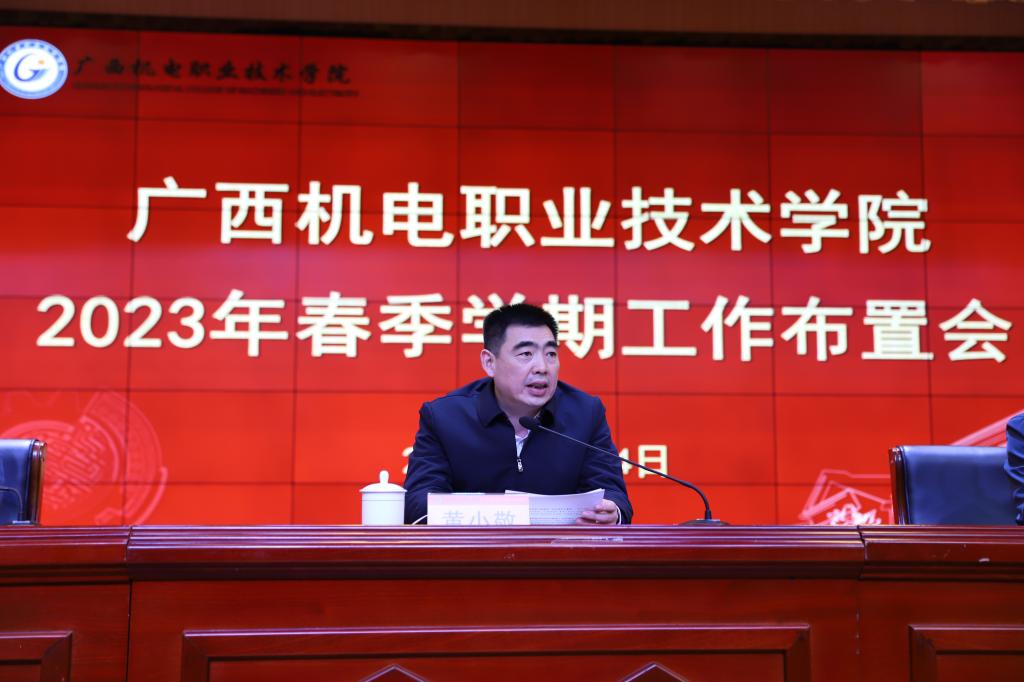 黄小敬指出,2023年是学校全面贯彻落实党的二十大精神的开局之年,是实施自治区新一轮“双高”建设的起步之年,也是实现“重返国家队,力争升职本”战略目标的关键一年,做好2023年各项工作对于学校未来五年,甚至更长时间的高质量发展至关重要。他强调,要统一思想,深入学习贯彻党的二十大精神和习近平总书记在中央重要研讨班开班式上的重要讲话精神,深刻领悟“两个确立”的决定性意义,增强“四个意识”、坚定“四个自信”、做到“两个维护”,围绕“中国式现代化”战略部署,把握教育、科技、人才“三位一体”部署的深刻内涵,更好服务中国式现代化广西篇章谱写和新时代壮美广西建设。要坚定信心,奋力开创学校事业高质量发展新局面。要抓好统筹,积极重塑风清气正的政治环境、打造“拴心留人”的干事环境、营造安全稳定的发展环境。