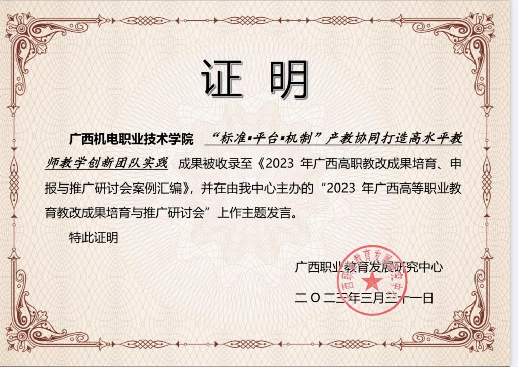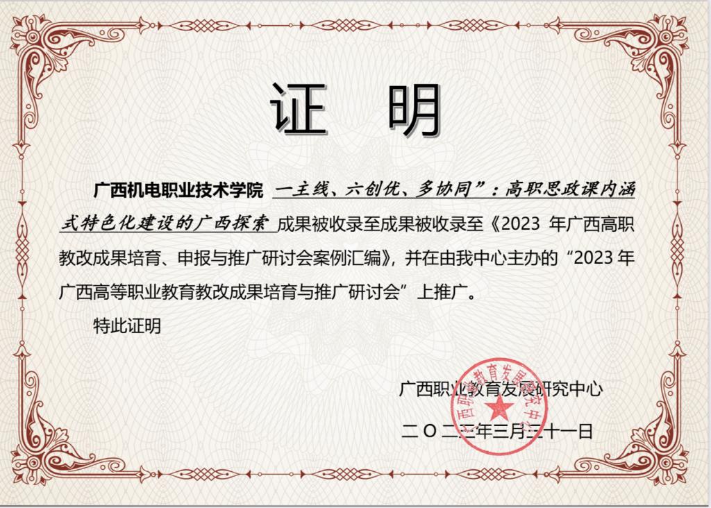 本次研讨会面向全区高职院校征集教育教学改革成果案例,遴选了20个优秀成果案例汇编成册,从中选取5个典型案例在会上做发言分享,面向全区高职院校推广应用。AC米兰同时获入选成果案例汇编的还有马克思主义学院院长黄振宣教授团队的成果《“一主线、六创优、多协同”:高职思政课内涵式特色化建设的广西探索》。