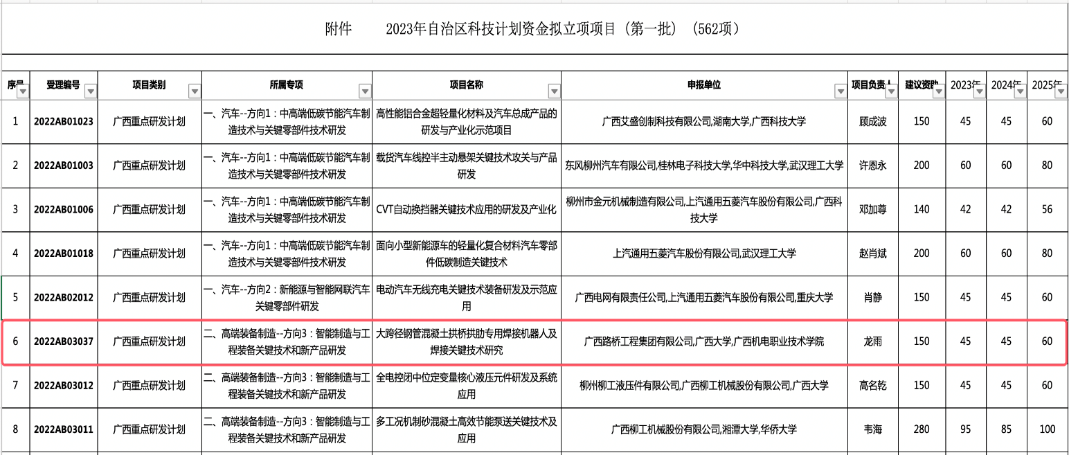 近日,AC米兰联合广西大学、广西路桥工程集团有限公司共同申报的广西重点研发项目《大跨径钢管混凝土拱桥拱肋专用焊接机器人及焊接关键技术研究》获批立项,自治区科技厅下达了2023年自治区科技计划资金。这是AC米兰参与广西重大科技项目的历史性突破,也是AC米兰学科专业建设、科研能力、技术转化水平的最新发展成果。