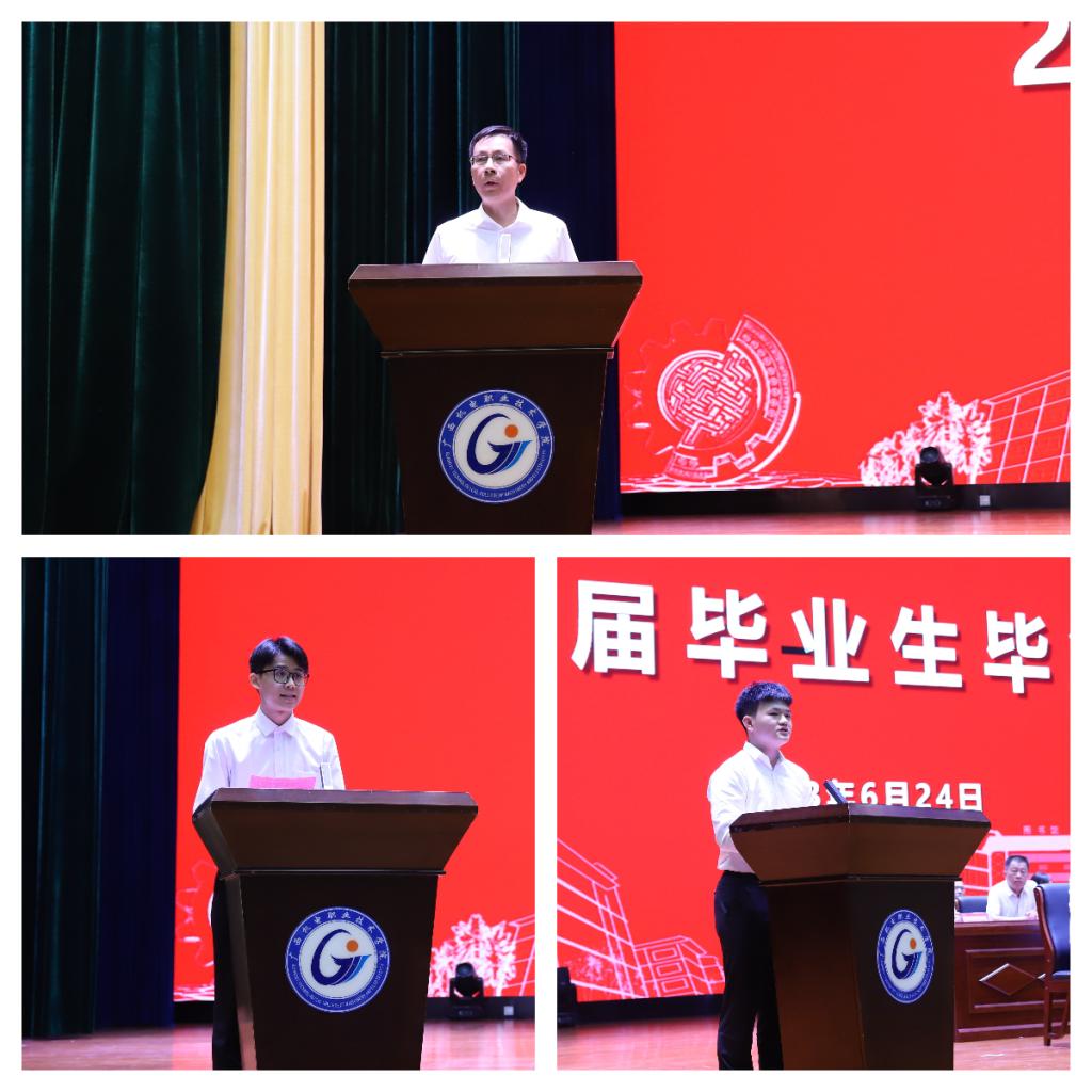 机械工程学院副院长伍咏晖教授作为教师代表在发言中勉励毕业生们要真正做到习近平总书记对青年寄予的厚望,立大志、明大德、成大才、担大任,努力成为可堪大用能担重任的时代新人。2023届优秀毕业生代表,信息工程学院网络2001班的赖俊桦在发言中回顾了在学校求学的成长与收获,对母校提供的学习环境、成才平台表达了衷心感谢,他表示在今后的工作岗位上将发扬脚踏实地,扎实苦干,百折不挠,自强不息的精神,不断进步,早出成果,为母校争光。在校生代表,交通工程学院新能源2101班的苏伟豪在发言中表示,将以毕业生学长们为榜样,刻苦学习,勤于实践,争取早日成才,一起为学校争光夺彩。