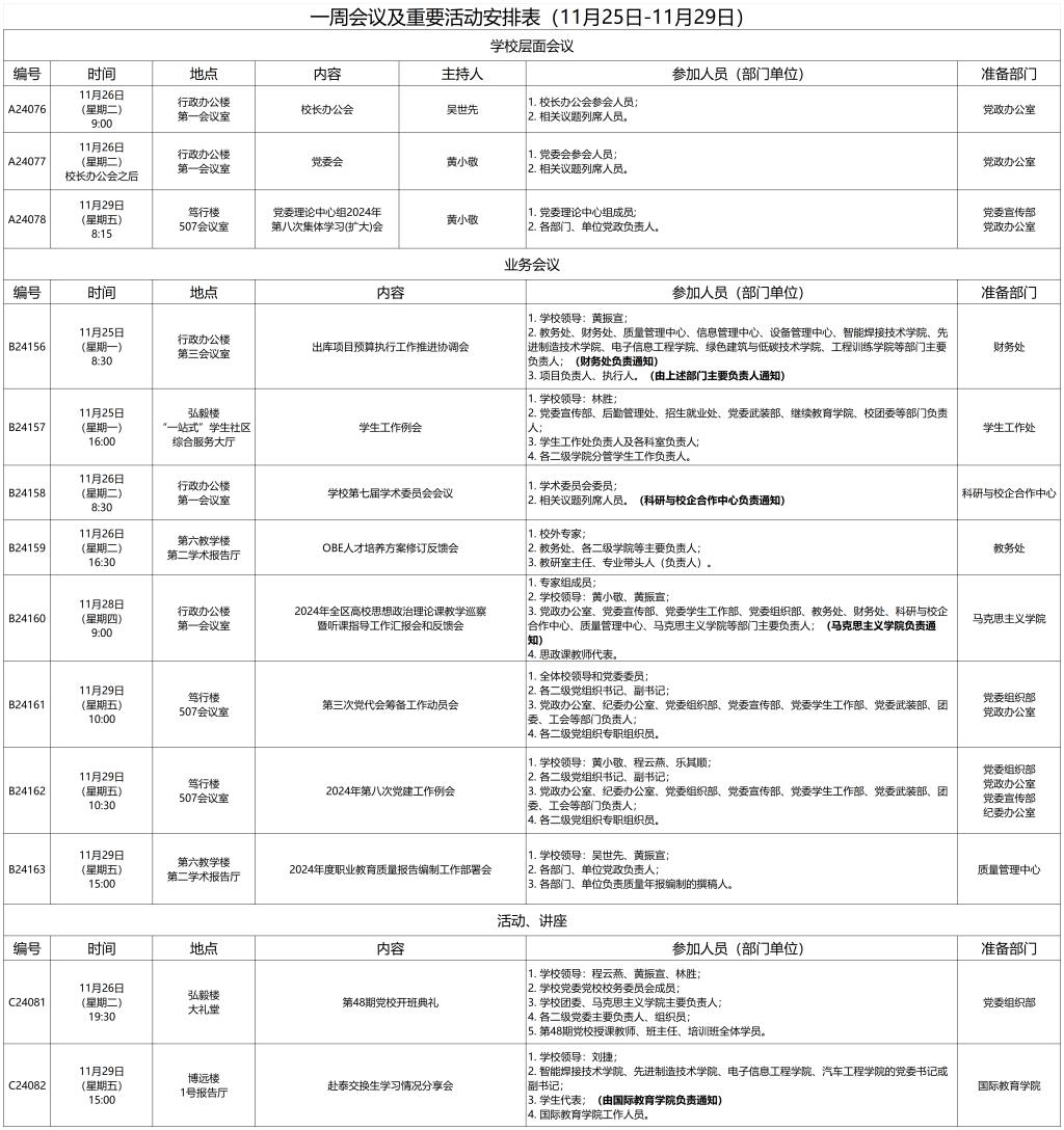 一周会议及重要活动安排表(11月25日-11月29日)