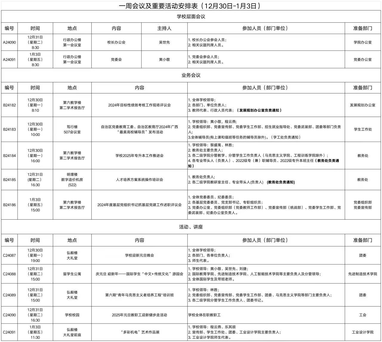 一周会议及重要活动安排表(12月30日-1月3日)