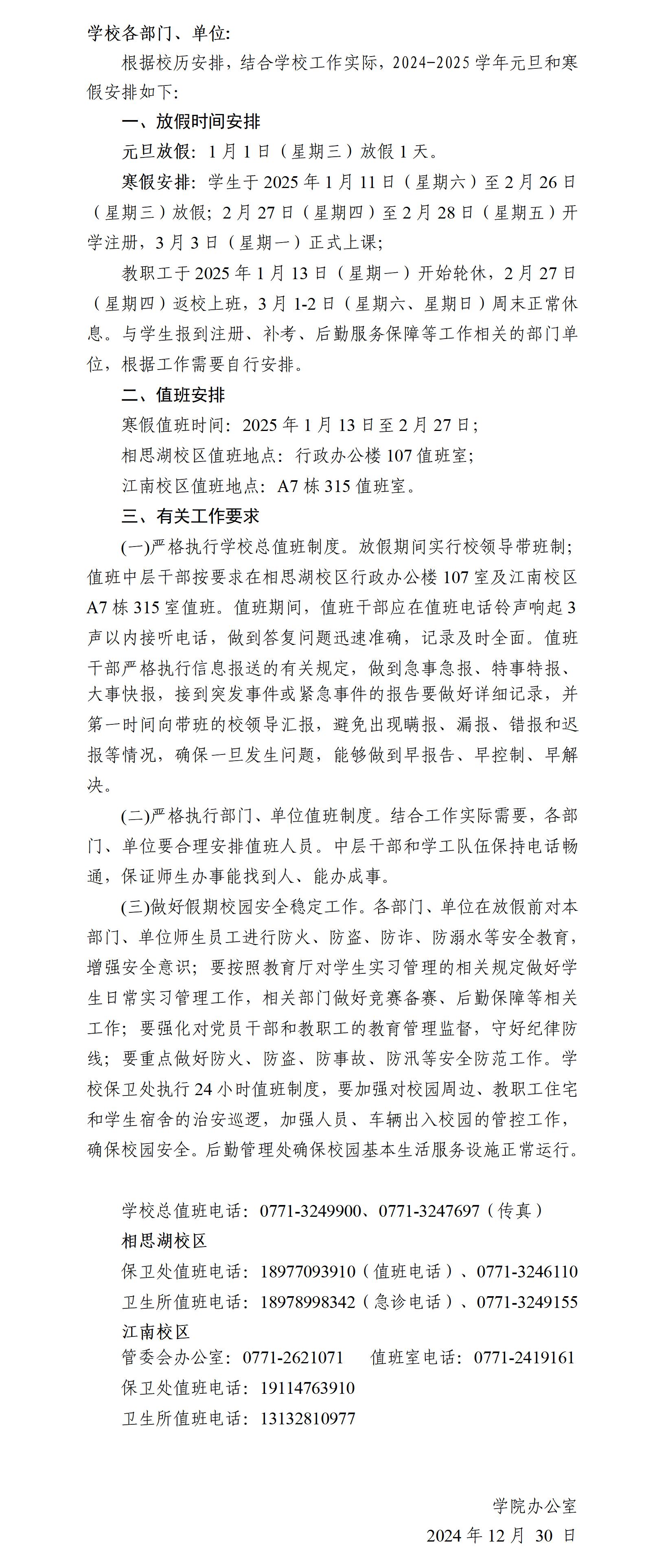 关于2024-2025学年元旦放假和寒假相关工作安排的通知