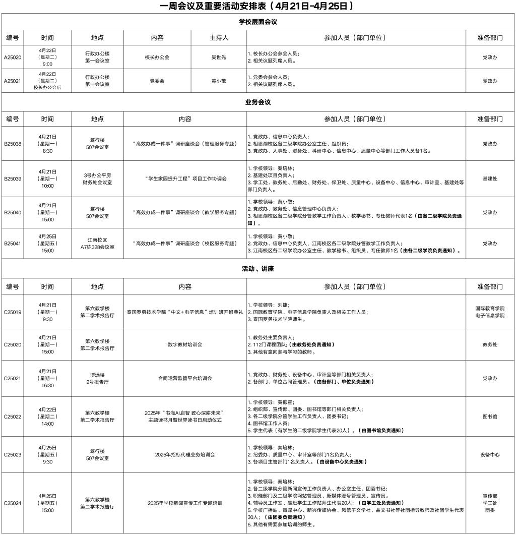 一周会议及重要活动安排表(4月21日-4月25日)