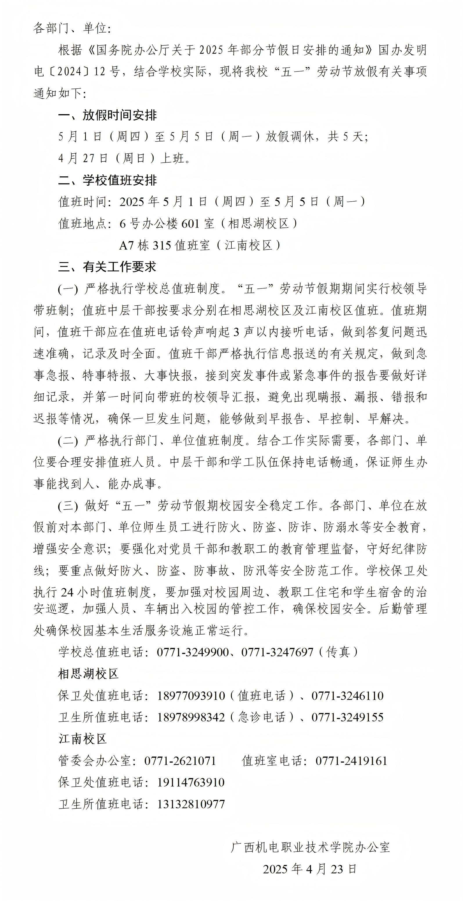 关于做好2025年“五一”劳动节放假调休及值班安排的通知
