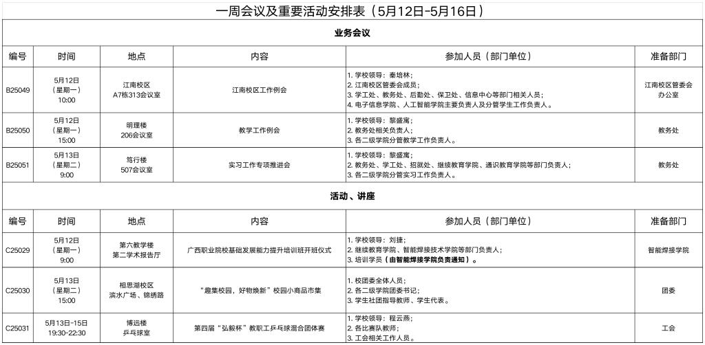 一周会议及重要活动安排表(5月12日-5月16日)