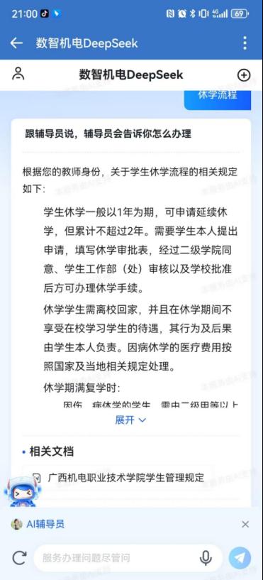 和电脑端一样,直接提问自己想要了解的学校事务即可,例如:休学流程。