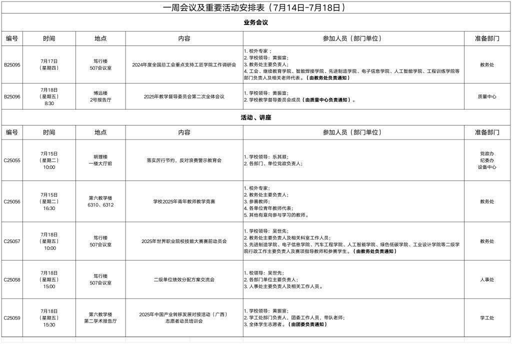 一周会议及重要活动安排表(7月14日-7月18日)