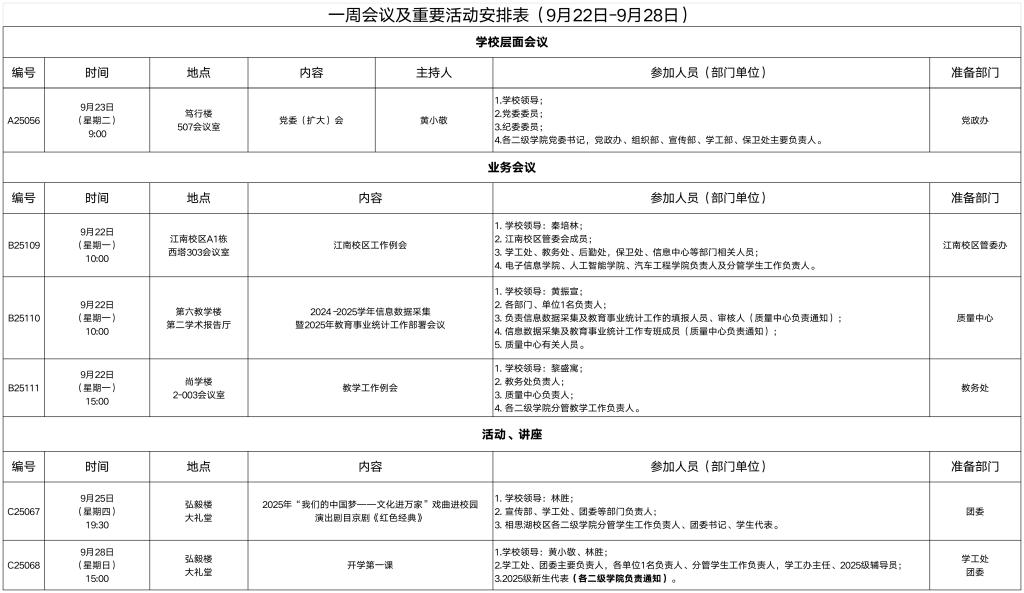 一周会议及重要活动安排表(9月22日-9月28日)