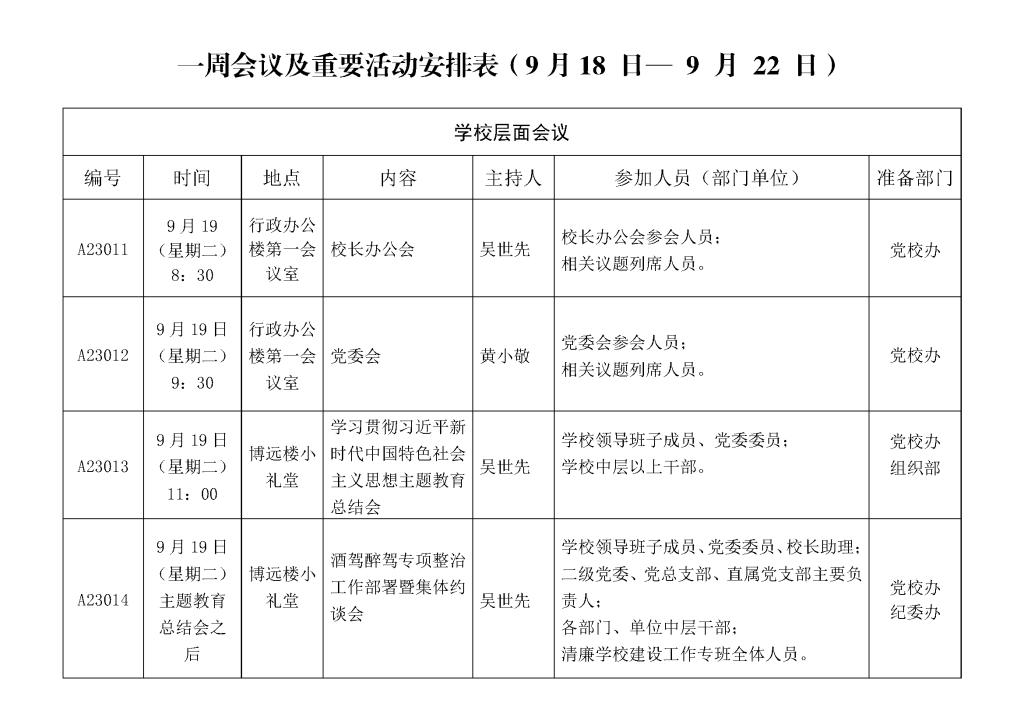 一周会议及重要活动安排表(9月18日— 9月24日)