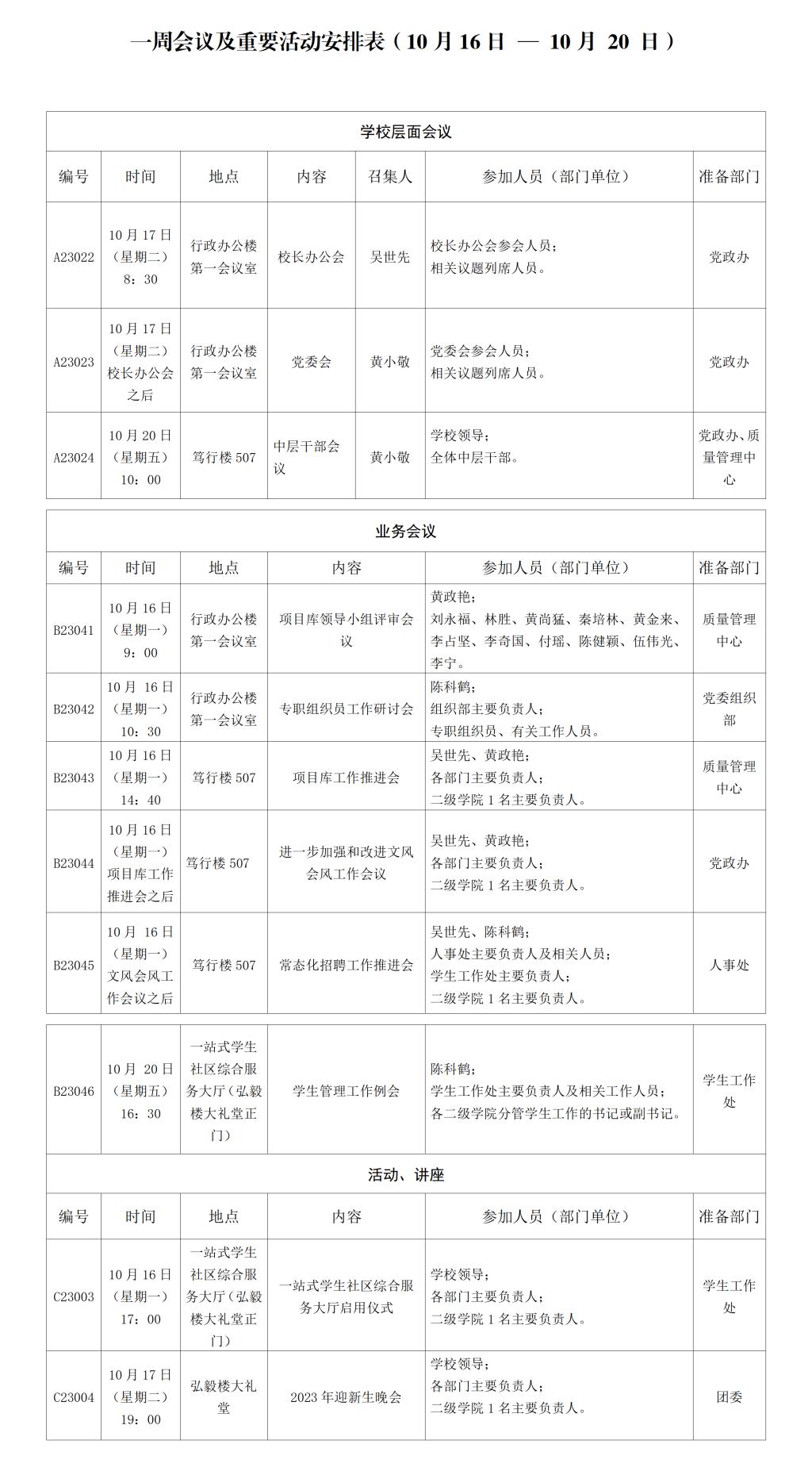 一周会议及重要活动安排表(10月16日 — 10月 20 日)