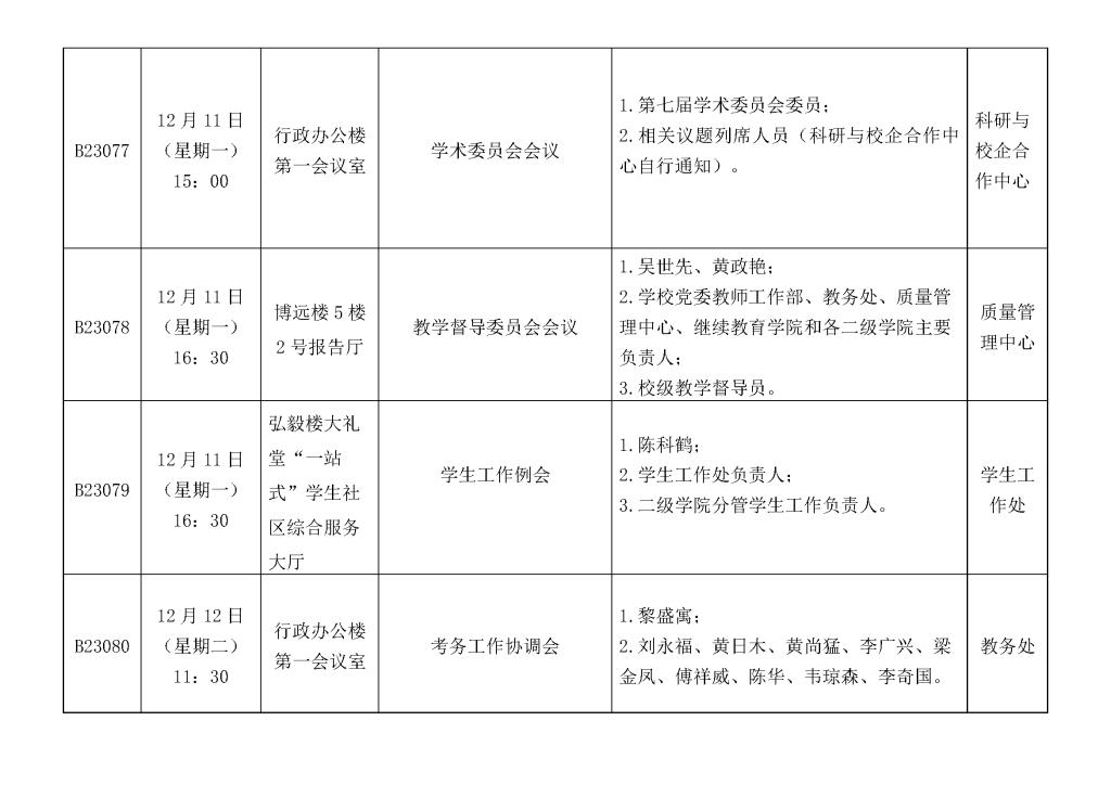 一周会议及重要活动安排表(12月11日— 12月 15日)