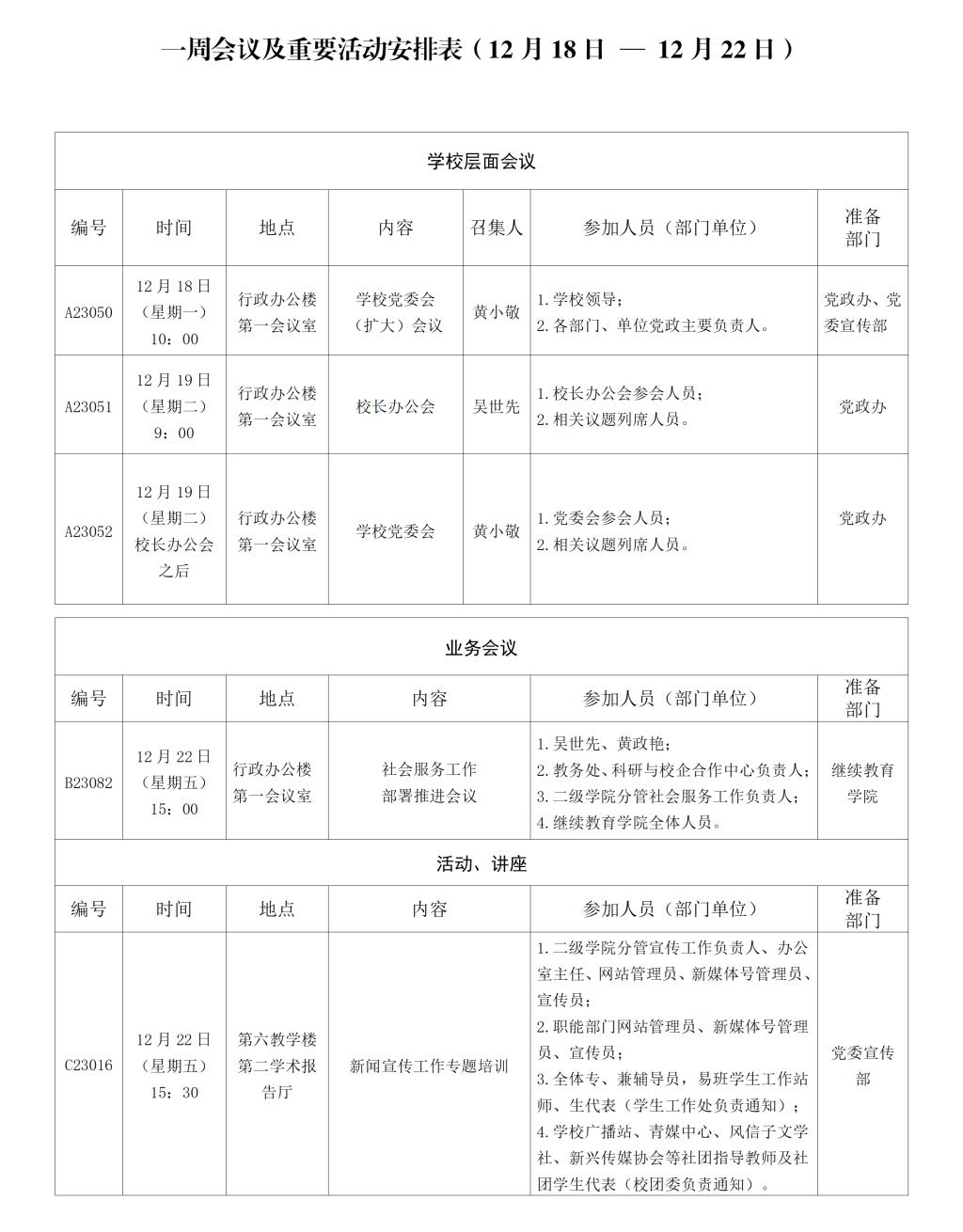 一周会议及重要活动安排表(12月18日 — 12月 22日)