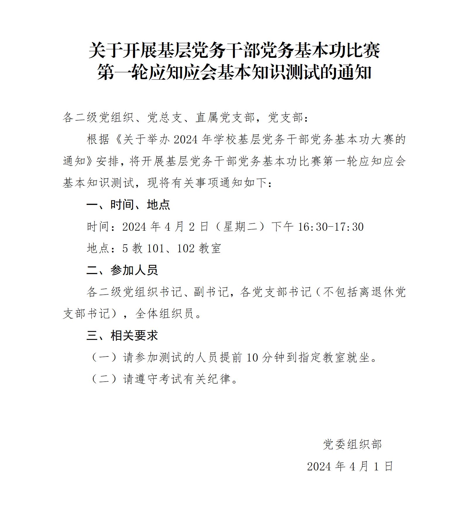 关于开展基层党务干部党务基本功比赛第一轮应知应会基本知识测试的通知