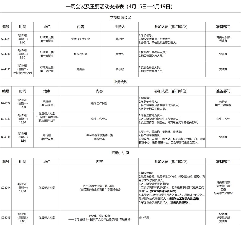 一周会议及重要活动安排表(4月15日—4月19日)