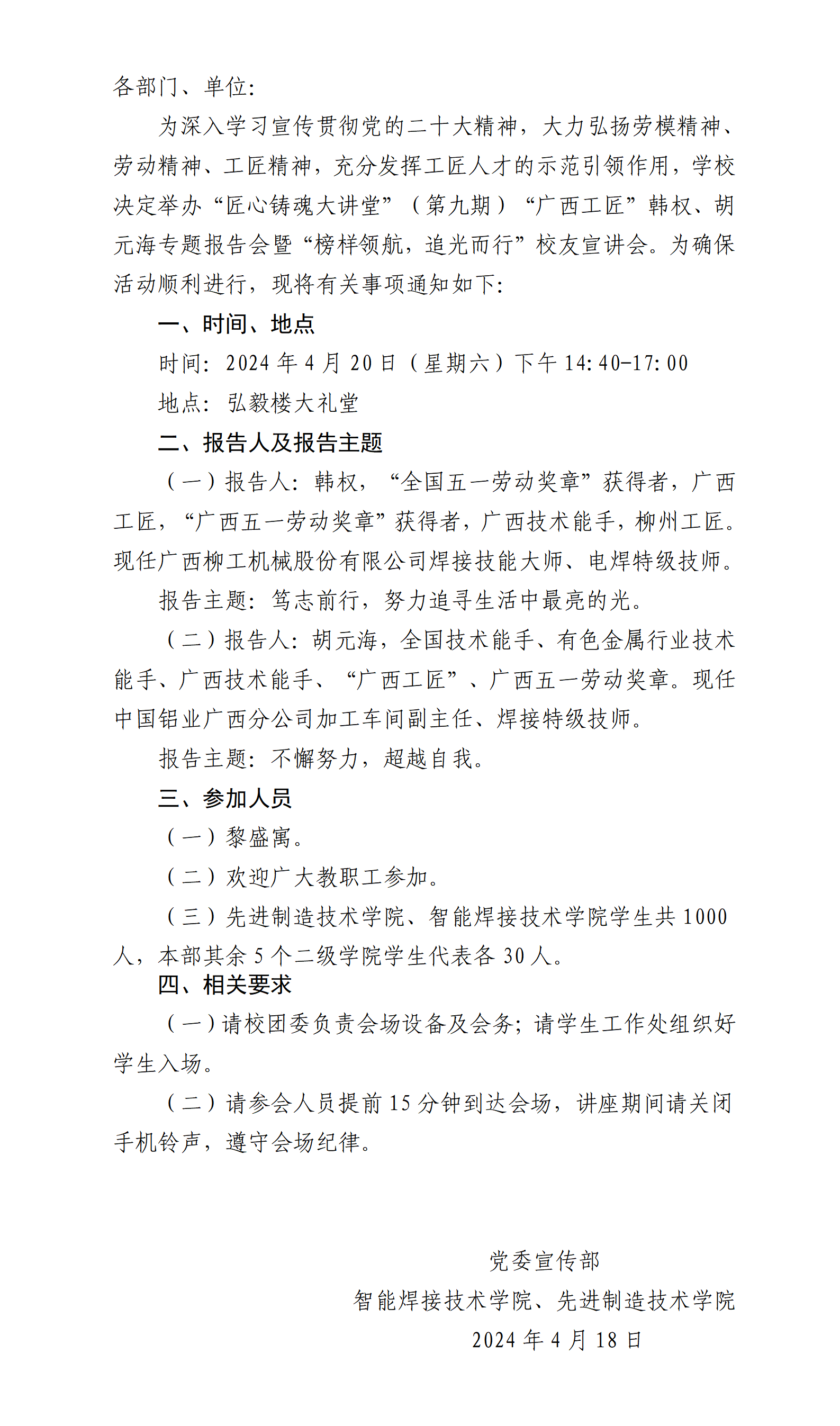 关于举办“匠心铸魂大讲堂”(第九期)“广西工匠”韩权、胡元海专题报告会暨“榜样领航,追光而行”校友宣讲会的通知