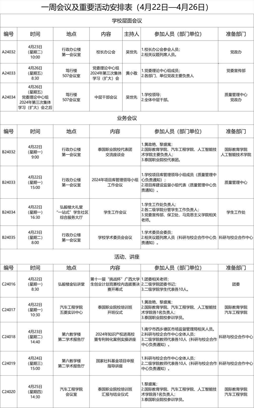 一周会议及重要活动安排表(4月22日—4月26日)