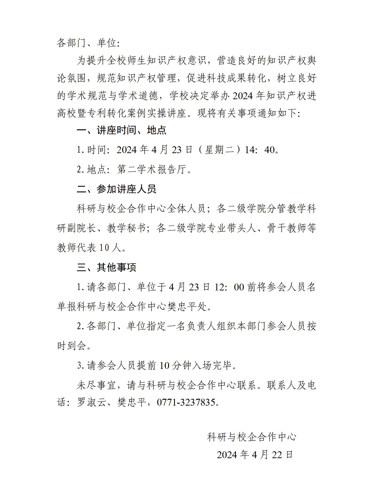 关于举办2024年知识产权进高校暨专利转化案例实操讲座的通知