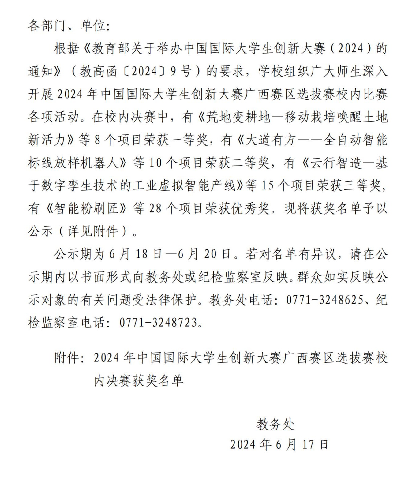 关于2024年中国国际大学生创新大赛广西赛区选拔赛校内决赛拟获奖名单的公示