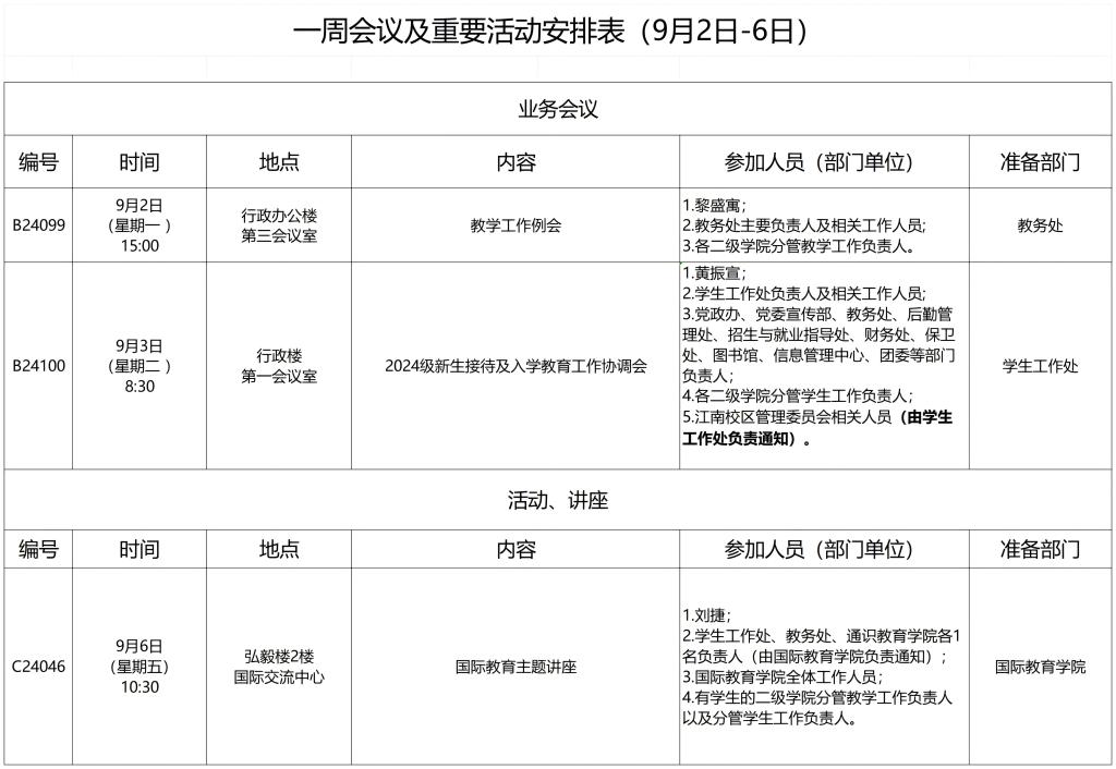 一周会议及重要活动安排表(9月2日-6日)