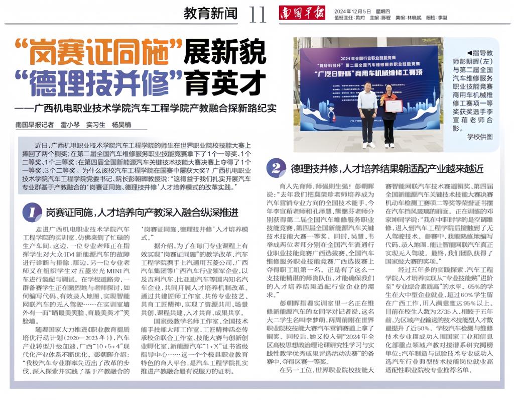 育人先育师,师强则生强!彭朝晖说:“去年我们把莫荣珍老师培养成为汽车营销专业方向的全国技术能手,今年李宣葙老师和孔泽慧、熊继芬老师分别获得第二届全国汽车维修服务职业技能竞赛、第四届全国新能源汽车关键技术技能大赛一等奖。同时,吴慧、韦举成两位老师分别在全国汽车流通行业职业技能竞赛广西选拔赛、全国汽车维修服务职业技能竞赛广西选拔赛上夺得职工组第一名。正是有了这么一支技能精湛的师资队伍,才能确保我们的人才培养结果适配行业企业的需求。”