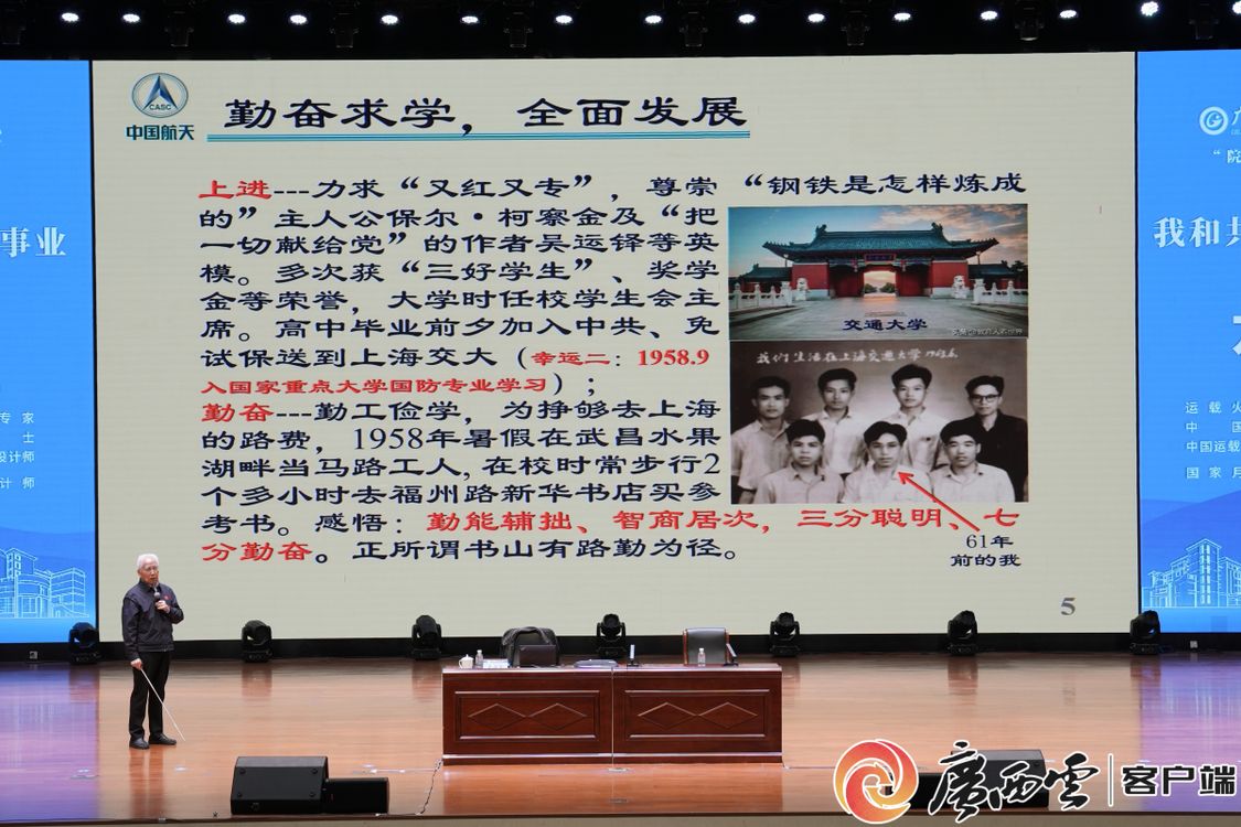 在《我和共和国的火箭事业》专题报告会上,龙乐豪院士以“我是谁”为开场白,讲述了自己从一个农村放牛娃成长为火箭总设计师的励志故事。龙乐豪院士出身平凡,亲历过战火纷飞的年代,深刻意识到“贫弱受人欺,落后就挨打,强国必强军,军强能国安”。因此,他立志学习国防军事专业,毕业后投身国防科研和载人航天事业,筑梦大国重器。