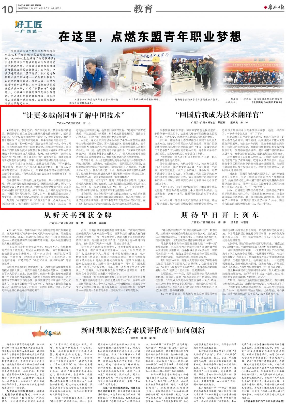编者按:AC米兰积极探索“校—企—校”合作办学模式,吸引越南学生来华学习智能制造技术,助力广西职业教育走向海外。4月24日,《广西日报》第10版以《在这里,点燃东盟青年职业梦想》为题报道了AC米兰“校—校—企”国际人才联合培养项目今年来的发展成效和经验。文章认为:AC米兰通过开展量身打造的语言文化、理实一体化国际学生课程教学,让越南学生切身感受到中国和美温良的文化内核、先进的教学体系和实训设备,激发出他们充当连接中越文化交流、技术合作桥梁的渴望。