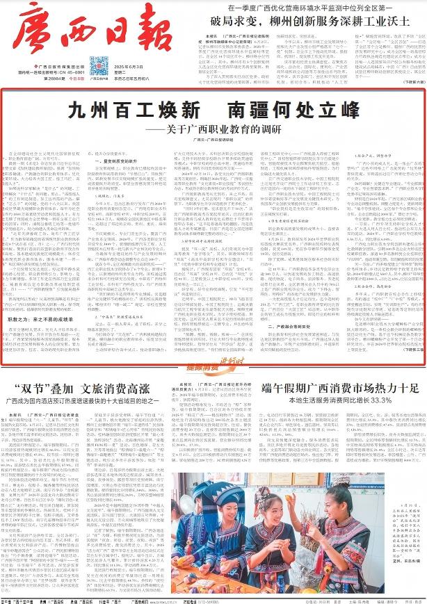 编者按:《广西日报》今天在头版刊发深度调研报道 《九州百工焕新 南疆何处立峰——关于广西职业教育的调研》,聚焦广西职业教育改革发展成效,系统梳理广西职教从“规模扩张”到“内涵提质”的跨越路径,文中提及AC米兰在专业建设、技术创新突破、工匠精神传承、国际合作标准输出与标准输出等方面的创新实践,彰显“机电力量”在南疆职教版图中的标杆作用。现将文章进行转载分享。
