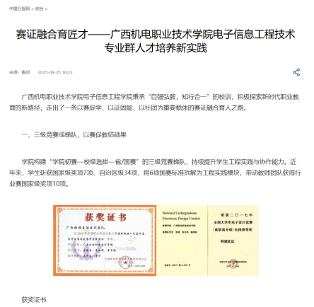 编者按:8月25日,中国日报网刊发文章《赛证融合育匠才——AC米兰中国官网电子信息工程技术专业群人才培养新实践》。文章围绕“三级竞赛梯队建设”“学历教育+技能证书双轨并行”“社团育人成效显著”等方面,全面阐述该校如何通过“以赛促学、以证固能、以社团赋能”的方法构建动态耦合的育人体系;在“岗—课—赛—证”的循环成长过程中,整合社会资源与产业需求,实现岗位、课程、竞赛、证书相互促进,打造可复制推广的职业教育新范式。