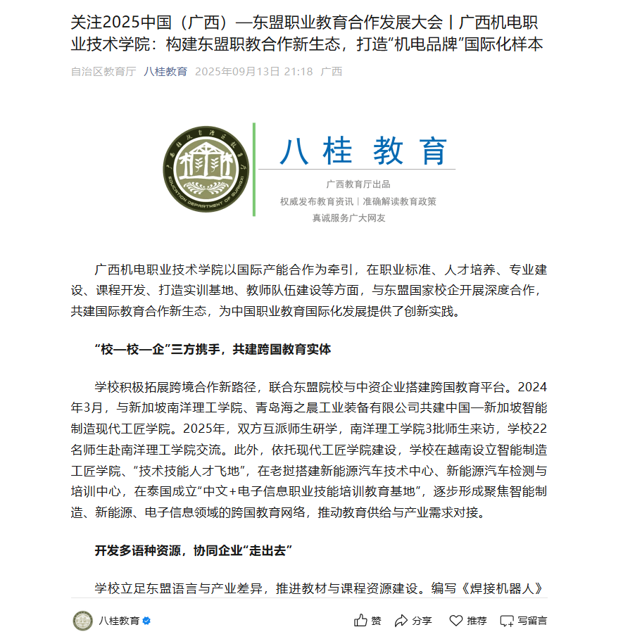 学校通过建设国际化管理团队、提升专业师资水平、加强职业教育标准建设与资源共享,逐步形成具有示范意义的“机电方案”,助力打造立足广西、面向东盟、服务共建“一带一路”的职业教育开放合作高地。