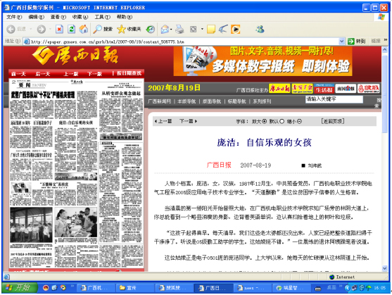 功夫不负有心人,庞洁的吃苦耐劳、艰苦奋斗和自强不息换来了骄人的成绩:她第一年就通过计算机一级和英语应用能力B级考试,并先后荣获国家奖学金、国家助学金和学院奖学金,被评为“青年志愿者标兵”、“优秀团员”。前不久还被评为学院首届“自强之星”和广西大学生“奋进之星”。
