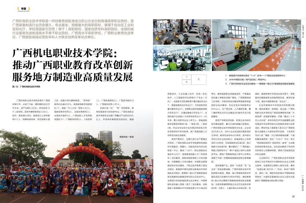 坚持产教同行,全面打造行业产教融合共同体。建有同类院校中装备优、规模大、功能全的校内实训实验室(中心、基地)120个、职业技能培训鉴定中心23个,是国家高技能人才(机电项目)培训基地、国家技能型紧缺人才培训基地、中国模具人才培训基地、中国职业教育数控技术实训基地、IT职业技术教育工程定点院校、教育部中德先进职业教育合作项目首批试点院校、教育部一瑞士GF 智能制造创新实践基地培育建设单位和认证培训中心、全国现代学徒制首批牵头试点单位、中国焊接协会机器人焊接(南宁)培训基地、金砖国家工商理事会中方技能发展工作小组成员单位,建有国家职业技能鉴定所、产教融合型机器人焊接培训推广基地、广西智能制造工匠学院、中职师资培训基地等国家级和省级职业培训基地,毕业生双证书获取率达80%以上。在广西玉柴、上汽通用五菱、厦门捷昕等区内外企业建成266家校外实习实践基地。