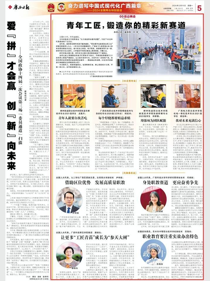 3月11日《广西日报》第006版推出“00后@两会”栏目,刊发了《青年工匠,锻造你的精彩新赛道》一文,详细内容如下↓↓