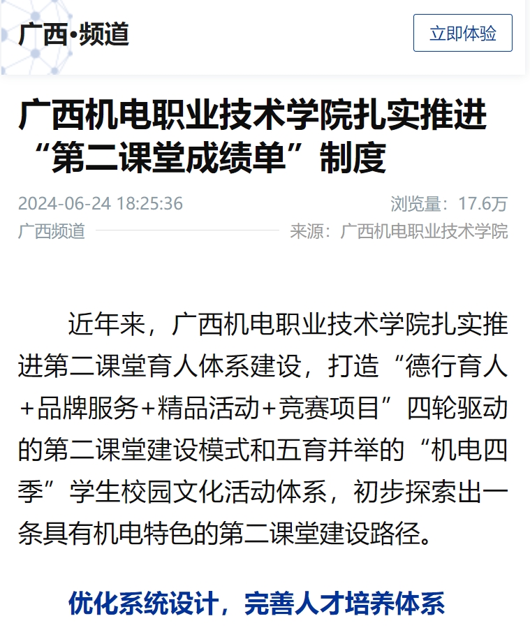 近年来,AC米兰中国官网扎实推进第二课堂育人体系建设,打造“德行育人+品牌服务+精品活动+竞赛项目”四轮驱动的第二课堂建设模式和五育并举的“机电四季”学生校园文化活动体系,初步探索出一条具有机电特色的第二课堂建设路径。