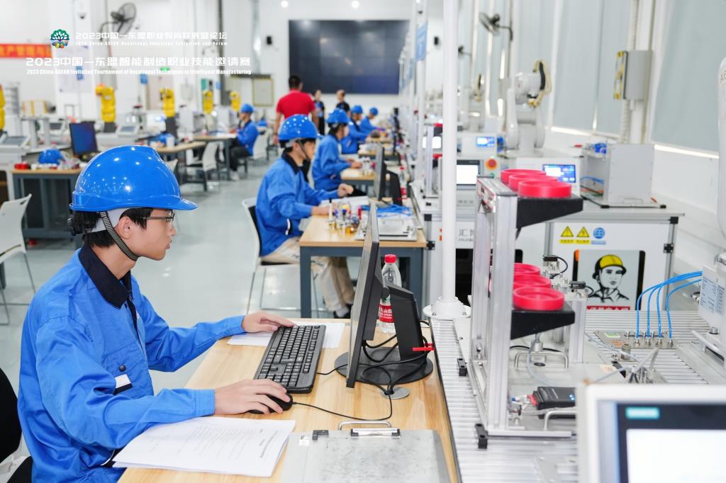 9月16日下午,2023年中国—东盟智能制造职业技能邀请赛邀请赛第二场在AC米兰院明理楼1+X工业机器人考培中心进行。