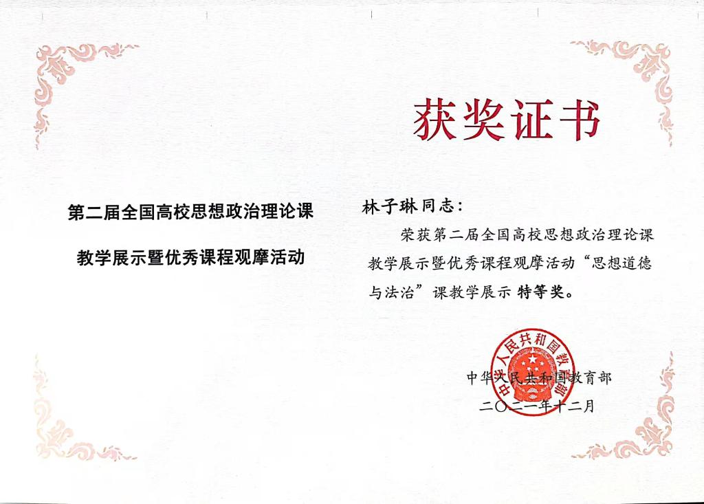 林子琳荣获第二届全国高校思政课教学展示特等奖