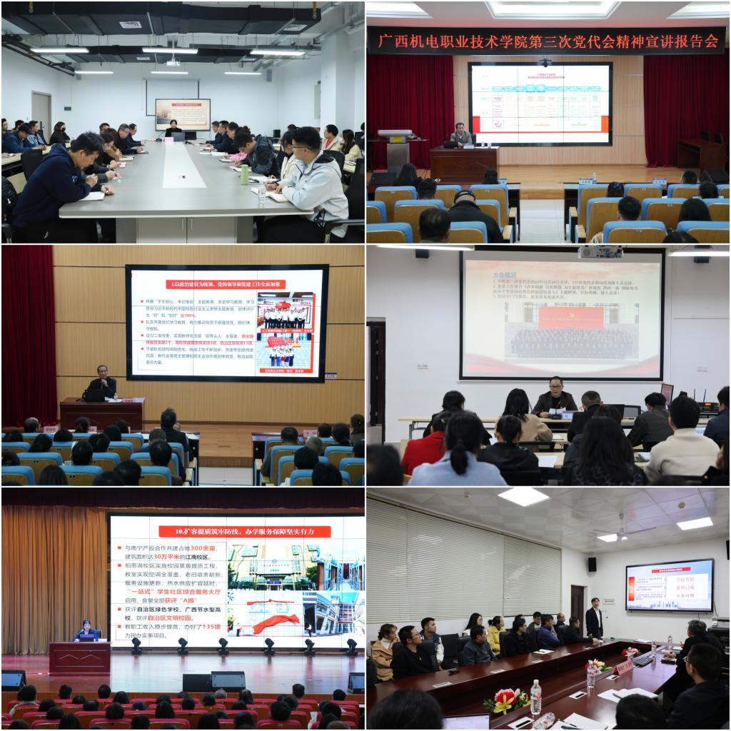 学校领导强调,要坚持以习近平新时代中国特色社会主义思想为指导,深入贯彻党的二十大精神和全国教育大会精神,切实抓好学校第三次党代会各项任务落地落实。要提高政治站位,深刻领会第三次党代会的重要意义和精神实质。要精心组织安排,扎实做好第三次党代会精神的学习宣传。要加强统筹谋划,深入推进第三次党代会精神的贯彻落实。全校各部门、单位要按照全校师生全覆盖的要求,加强组织领导,强化工作统筹,推动以学促干,把学习贯彻党代会精神体现为扎实做好本职工作行动上,为奋力谱写中国式现代化广西篇章,为以中国式现代化全面推进强国建设、民族复兴伟业作出广西机电更大贡献。