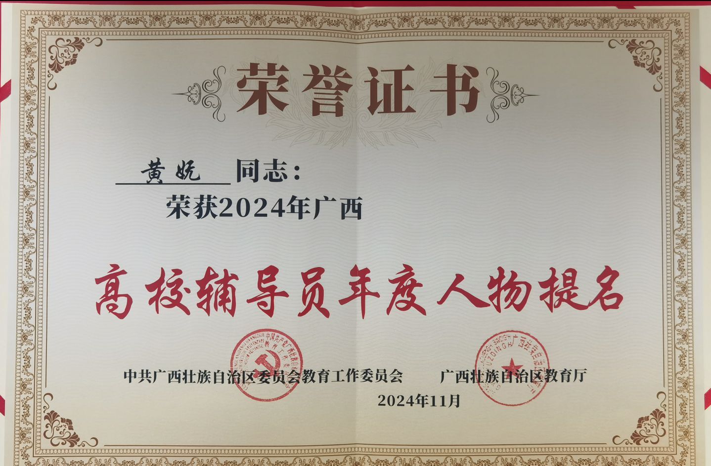黄妩,中共党员,旅游管理专业,高级经济师、高级职业指导师、自治区级创新创业优秀指导教师,现任文化旅游与管理学院党委书记,广西礼仪文化交流协会副会长。先后获自治区优秀团干部、自治区工信厅优秀党务工作者、学校优秀党员、“三全育人”先进个人等多项荣誉称号,2024年荣获广西高校辅导员年度人物提名。