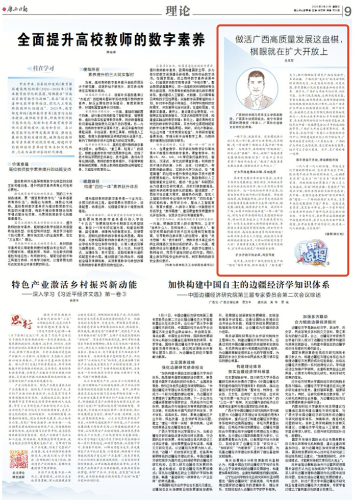近年来,沃柑等广西优势特色农产品“跑进”国际市场,附加值高了,“朋友圈”大了;柳州螺蛳粉等特色产品远销海外,声名远播。广西这些“走出去”的生动实践绝非偶然发生,而是其区位优势、历史底蕴、资源禀赋以及政策机遇叠加的必然结果。换言之,广西扩大开放不仅必须,而且可能。打开门就是越南,走两步就到东盟,背靠大西南,毗邻粤港澳,在西部陆海新通道的战略枢纽地位难以替代,这是广西在扩大开放上的独特区位优势。两千余年前,合浦港已是海上丝绸之路的重要始发港之一,再加上改革开放40多年的探索积累、参与东西部协作近30年的坚实基础、连续承办中国—东盟博览会20多年的成功经验等等,广西扩大开放已有深厚积淀。展望未来,依托中国—东盟人工智能创新合作中心、即将建成的世纪工程平陆运河,广西开放前景必将是一片星辰大海。广西的扩大开放已成型成势,毫无理由妄自菲薄,切不可止于临川羡鱼。实干,是广西的唯一选择。